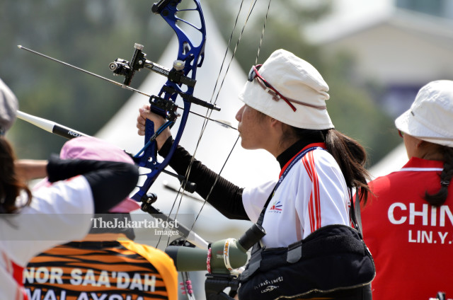 Pemanah Putri Jepang, Nagano Miho membidik sasaran pada babak kualifikasi nomor Compound Open Putri Asian Para Games 2018 cabang panahan di Lapangan Panahan, Gelora Bung Karno, Jakarta, Minggu (7/10/2018). INAPGOC/Mudak Yasin