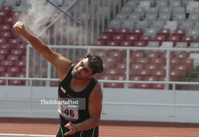 Atlet Iran Azizi Behzad turun pada pada nomor lempar lembing F12/13 putra Asian Para Games ke-3 di Stadion Utama Gelora Bung Karno, Jakarta, Senin(8/25). INAPGOC/ Jessica Margaretha/18