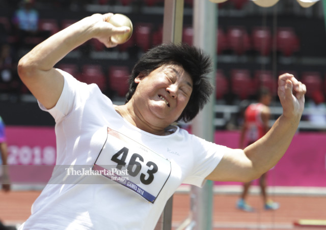 Atlet Kazakstan Ayaubayeva Zhaniya turun pada nomor tolak peluru F11/12 putri Asian Para Games ke-3 di Stadion Utama Gelora Bung Karno, Jakarta, Senin(8/25). INAPGOC/ Jessica Margaretha/18