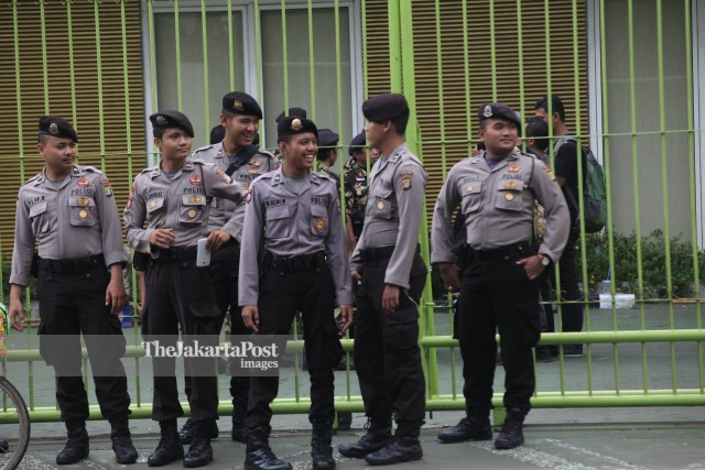Aparat kepolisian berjaga di depan Gedung DPP Partai Persatuan Pembangunan (PPP), Jalan Diponegoro, Jakarta Pusat, Senin (7/3/2016). Penjagaan ini menyusul batas waktu pengambilalihan kantor DPP oleh kepengurusan PPP yang mengatasnamakan DPP hasil muktamar Bandung. - JP/Dhoni Setiawan/file/vja/19
