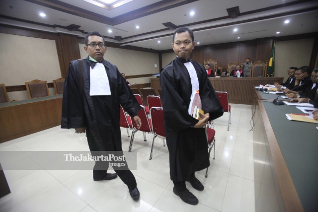 Two public lawyers Legal Aid Institute Tigor Gemdita Hutapea (right) and Obed Sakti underwent an inaugural hearing at the Central Jakarta Court on Monday (28/3/2016). Tigor Gemdita Hutapea and Obed Sakti became suspects along with a student and 23 labor activists during a demonstration in front of the palace. -JP / Dhoni Setiawan / file / Adi / 19