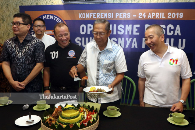 Senior politician Ginandjar Kartasasmita (second right), accompanied by Alumni Menteng 64 chairman Irlan Suud (center), Alumni Menteng 64 treasurer Dani Wanandi (right) and musician Ananda Sukarlan (left), slices a tumpeng (cone-shaped rice) after a press conference in Jakarta on Wednesday April 24, 2019. The conference was held to celebrate the ongoing quick count updates, which gave President Joko “Jokowi” Widodo and Ma’ruf Amin the edge over challengers Prabowo Subianto and Sandiaga Uno in the presidential election.. JP/Dhoni Setiawan/adi/19
