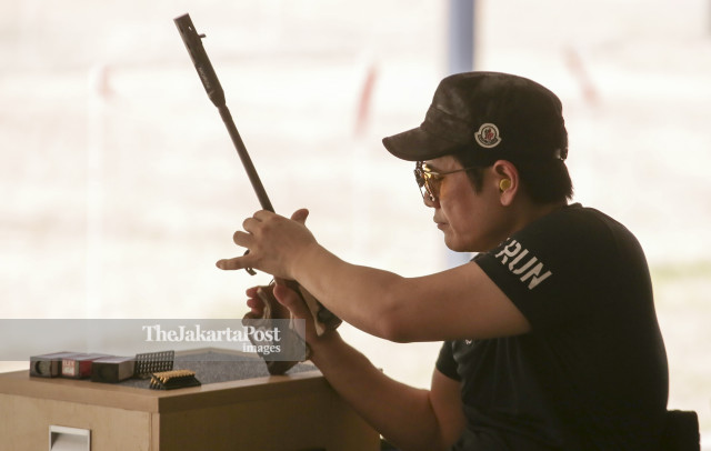-Penembak dari berbagai negara,melakukan tembakan dalam babak kualifikasi P4 50m Pistol Mixed SH1 Intermediated Results, Asian Para Games, 2018/INAPGOC/ tri budi prianto,