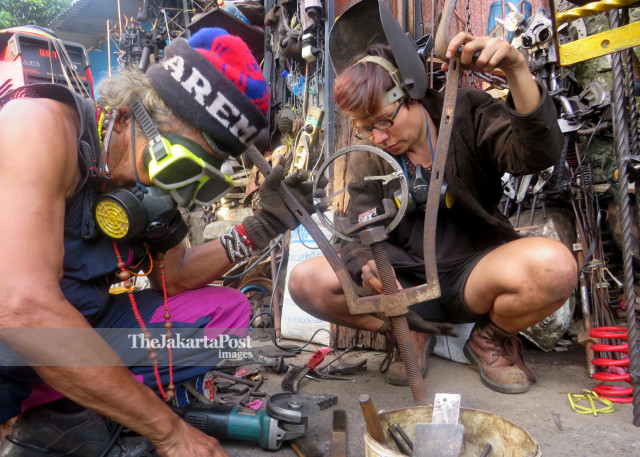 Seniman Ono Sumarsono atau Ono Gaf,72, (kiri), bersama seniman Inggris Michelle Laing berkolaborasi membuat patung menggunakan baja dan besi bekas di Malang, Jawa Timur, Rabu (19/6/2019). Selain di Malang, Ono Gaf yang dijuluki Man of Steel karena mampu mengubah barang-barang besi atau logam rongsokan menjadi karya yang mengagumkan dan bernilai seni tinggi ini, karyanya sudah tersebar di dalam dan luar negeri. - JP/Nedi Putra AW/vja/19