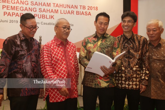 PT Totalindo Eka Persada Tbk vice president director Joni (left), president director Donald Sihombing (second left), director Solomo Sihombing (second right) and director Andre Chandra Biantoro inspect the company’s financial report after a shareholders meeting in Jakarta on Monday, June 24, 2019. - JP / Wendra Ajistyatama / Adi / 19