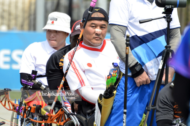Pemanah putra Jepang, Ajima Yutaka (tiga kiri) menunggu hasil bidikan pada babak Perdelapan Final nomor Compound Open Putra Asian Para Games 2018 cabang panahan di Lapangan Panahan, Gelora Bung Karno, Jakarta, Senin (8/10/2018). INAPGOC/Mudak Yasin
