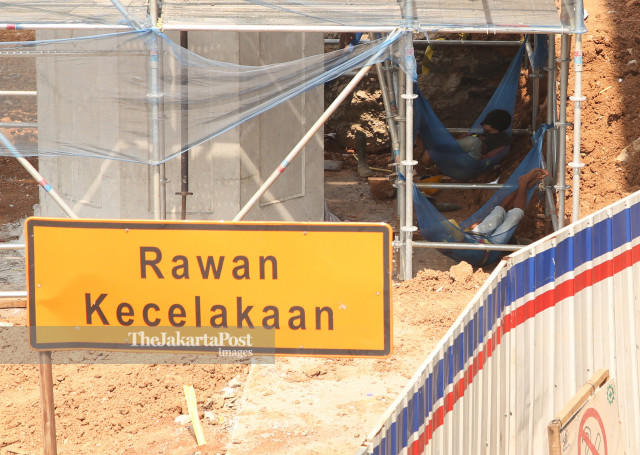 Two workers on the Bekasi - Cawang toll road construction project - Kampung Melayu on Jl. IN. Panjaitan, East Jakarta (Thursday, June 27, 2019) rests on a hammock tied to the iron pillars supporting the project. - JP / P.J.Leo / leo / 19
