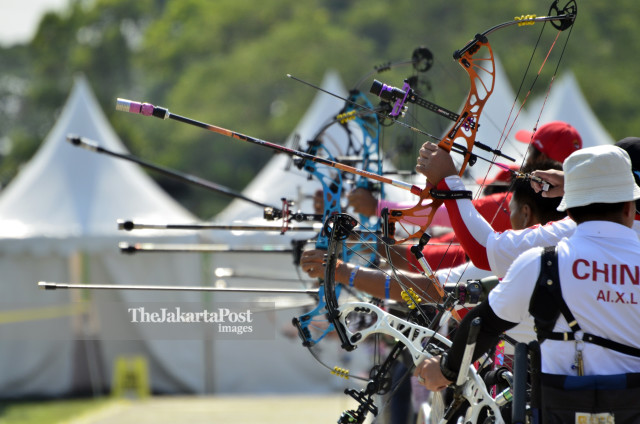 Pemanah putra pada babak Perempat Final nomor Compound Open Putra Asian Para Games 2018 cabang panahan di Lapangan Panahan, Gelora Bung Karno, Jakarta, Senin (8/10/2018). INAPGOC/Mudak Yasin