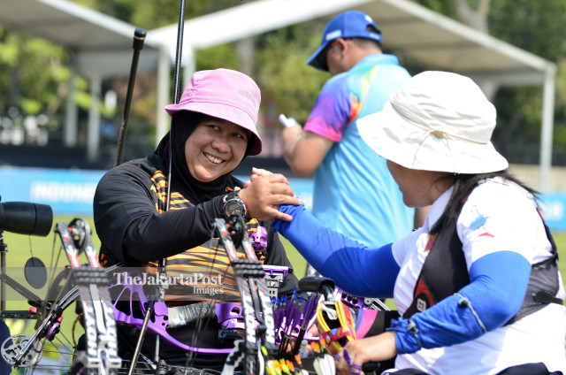 Pemanah putri Malaysia, Binte Alim Nur Syahidah berjabat tangan dengan pemanah putri China, Lin Yueshan setelah bertanding pada babak Perempat Final nomor Compound Open Putri Asian Para Games 2018 cabang panahan di Lapangan Panahan, Gelora Bung Karno, Jakarta, Senin (8/10/2018). INAPGOC/Mudak Yasin