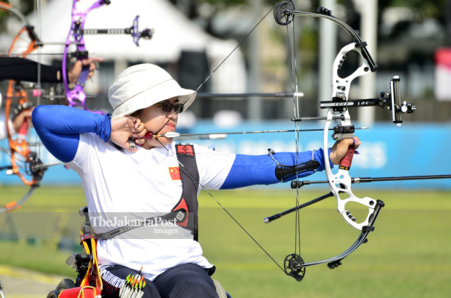 Pemanah putri China, Zhou Jiamin membidik sasaran pada babak Semi Final nomor Compound Open Putri Asian Para Games 2018 cabang panahan di Lapangan Panahan, Gelora Bung Karno, Jakarta, Senin (8/10/2018). INAPGOC/Mudak Yasin