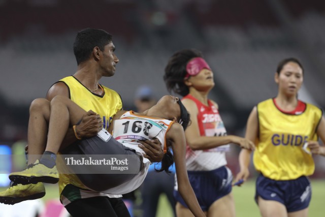 Atlet India, Raju Rakshitna dibopong asistennya setelah kelelahan tampil dalam cabang olahraga lari 1500m T11 Asian Para Games 2018 di Gelora Bung Karno (GBK) Senayan, Jakarta, Senin (8/10). INAPGOC /TJPimages/Agoes Rudianto/Don/18