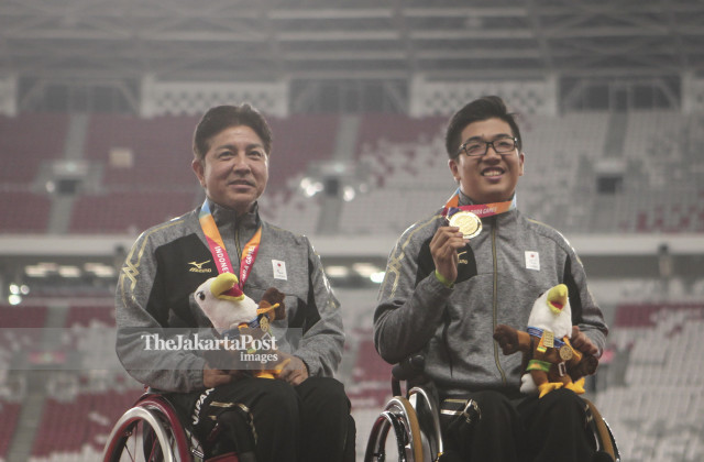 Tomoki Sato (kanan) atlet asal Jepang meraih emas, Hirokazu Ueyonabaru (kiri) atlet asal Japan meraih perak pada Asian Para Games 2018 cabang olahraga Para Athletics nomor 800M T51/52 di Stadion Gelora Bung Karno Jakarta Pusat. Senin 8/10/18. (INAPGOC/TJPIMAGES/MUHAMMAD BAGAS SYAHPUTRA/DON/18)