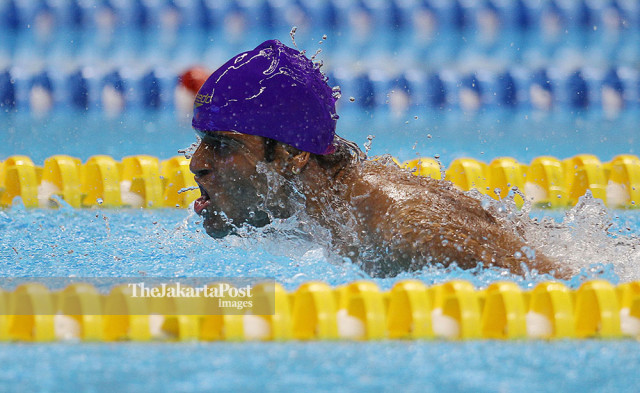 Atlet renang difabel asal India, Jadhav Suyash Nara meraih emas dalam babak final gaya kupu-kupu S7 (6-7) Asian Para Games 2018 di Aquatic Center, Gelora Bung Karno, Jakarta, Senin (8/10/2018). INAPGOC/Feri Setiawan