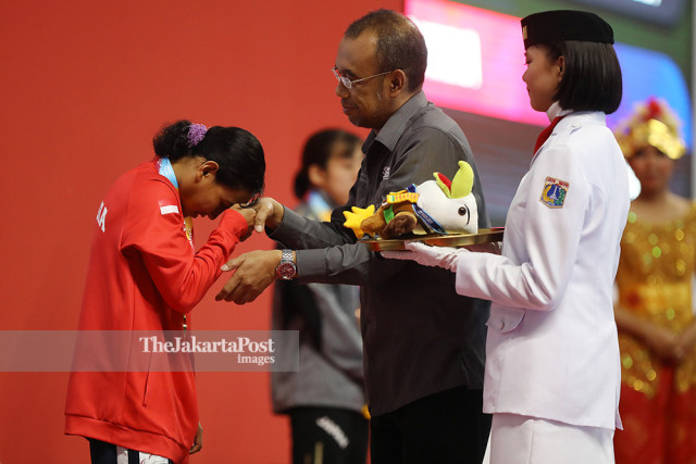 Perenang Indonesia Syuci Indriani (kiri) menerima medali emas dari Sekretaris Menpora Gatot S Dewabroto usai beraksi di nomor 100 meter gaya dada putri SB 14 di Gelora Bung Karno Aquatic Center, Senayan, Jakarta, Senin (8/10). Syuci berhasil meraih medali emas dengan catatan waktu 1 menit 23,95 detik. INAPGOC/Hendra