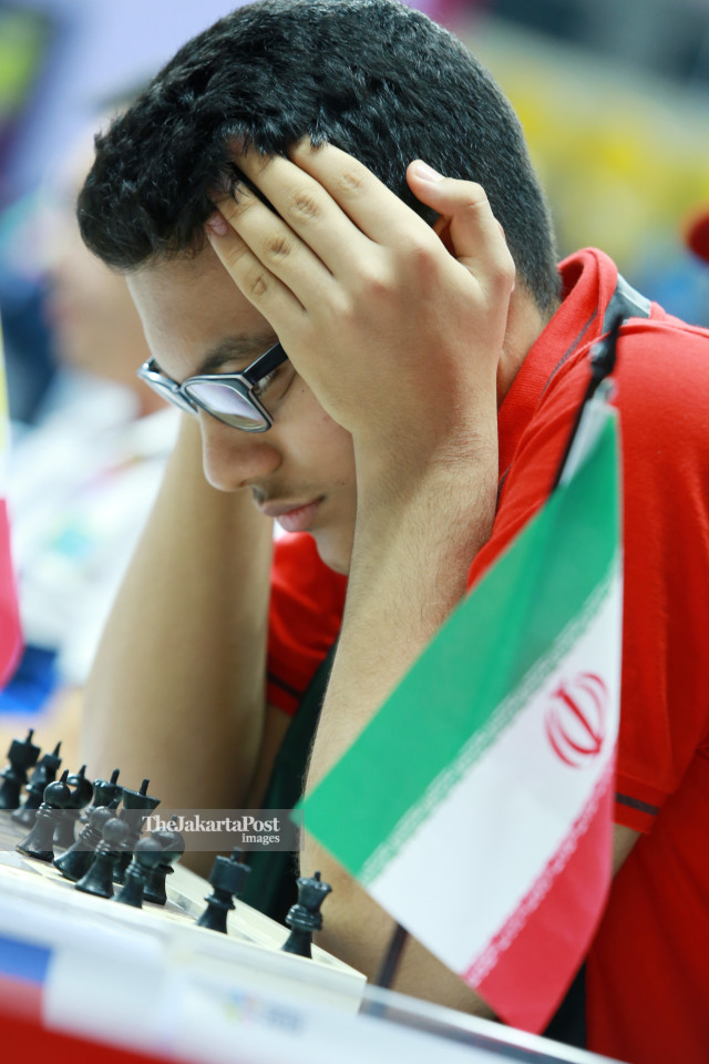 Atlit catur Iran Karimi Omid mengamati bidak catur yang akan dilangkahkannya ketika bertanding dalam babak penyisihan catur babak ke lima di ajang Indonesia Asian Para Games 2018, di Cempaka Putih Sports Hall Jakarta, Selasa (9/10/2018). INAPGOC/Setiyo