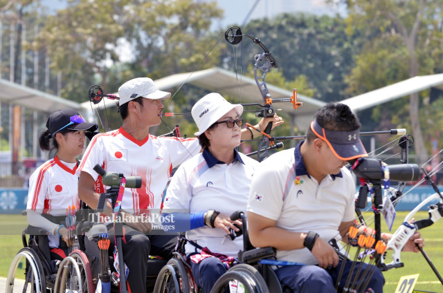 Pasangan pemanah W1 Compound Open Mixed Team mulai membidik sasaran pada babak Semi Final nomor W1 Compound Open Mixed Team Asian Para Games 2018 cabang panahan di Lapangan Panahan, Gelora Bung Karno, Jakarta, Selasa (9/10/2018). INAPGOC/Mudak Yasin
