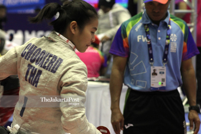Atlit Anggar Kursi Roda Thailand Chookerd Atitaya melakukan persiapan dalm pertandingan kategori Sabre Female Individual Senior B Wheel Chair Fencing Asian Para Games 2018 di GOR POPKI Cibubur, Jakarta. (9/10) INAPGOC/Fahry Rav