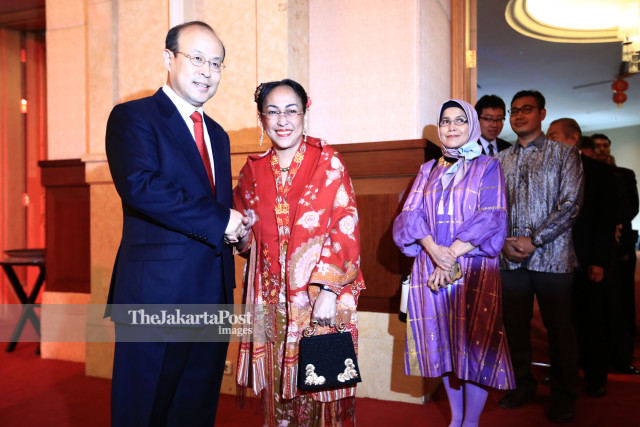 Duta besar Republik Rakyat Cina untuk Indonesia, Xiao Qian (kiri), menyambut putri presiden pertama Indonesia, Soekarno, Sukmawati Sukarnoputri (tengah) yang menghadiri resepsi penyambutan (the assumption of office) di Jakarta, 27 Februari 2018. - JP/ Jerry Adiguna/Adi/19