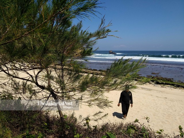 Volunteer Jawa Dipa Nusantara berjalan di Pantai Pasir Putih, pesisir selatan Blita, Minggu (30/7/2019). Pantai tersebut adalah satu dari belasan pantai dimana Mbah Wondo melakukan penghijauan dengan menanam ribuah pohon termasuk pohon cemara.-JP/Asip Hasani/Adi/19