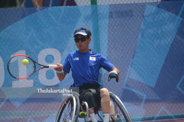 Jakarta, 9 Oktober 2018 KYU SEUNG KIM (KOREA) Babak Perempat Final Quad Tunggal Putra Tenis Kursi Roda Asian Para Games 2018 di lapangan tenis Klub Kelapa Gading, Jakarta, Selasa (9/10)
