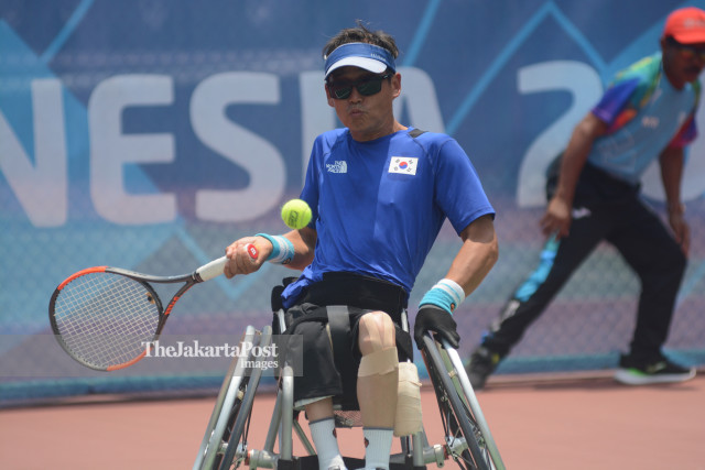 -Jakarta, 9 Oktober 2018 KYU SEUNG KIM (KOREA) Babak Perempat Final Quad Tunggal Putra Tenis Kursi Roda Asian Para Games 2018 di lapangan tenis Klub Kelapa Gading, Jakarta, Selasa (9/10)/INAPGOC/Dwi Ary etyadi
