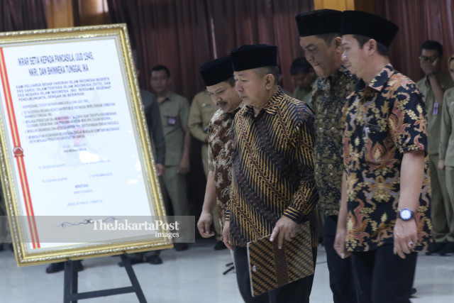 A number of former members of the Darul Islam / Indonesian Islamic Army (DI / TII) made readings pledging their allegiance to Pancasila, the 1945 Constitution, NKRI and Bhineka Tunggal Ika in Jakarta, Tuesday (08/13/2019). A total of 14 members of the Indonesian Muslim Harokah Large Family, former members of the Darul Islam / Indonesian Islamic Army (DI / TII) and former members of the Indonesian Islamic State (NII) took part in reading the faithful pledge. -JP / Dhoni Setiawan / Adi / 19