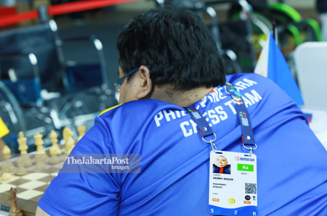 Atlit catur Filiphina Henry Roger mengamati bidak catur saat bertanding dalam babak penyisihan catur ke enam di ajang Indonesia Asian Para Games 2018, di Cempaka Putih Sports Hall Jakarta, Selasa (9/10/2018). INAPGOC/Setiyo Sc