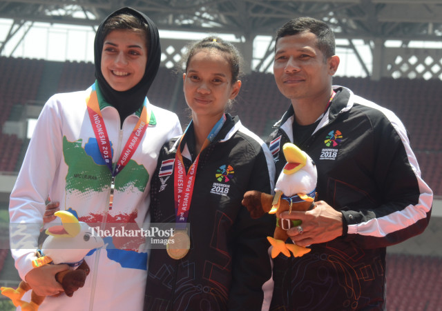 Atlet Iran Safarzadeh Ghahderijani Hagar memperoleh medali emas dan Atlet Thailand Tanomwong Suneeporn medali Perak, nomor 200 M Women T12 di Acara penyerahan medali di SUGBK, Jakarta, 09-10-2018, INAPGOC/Dewi Nurcahayani.