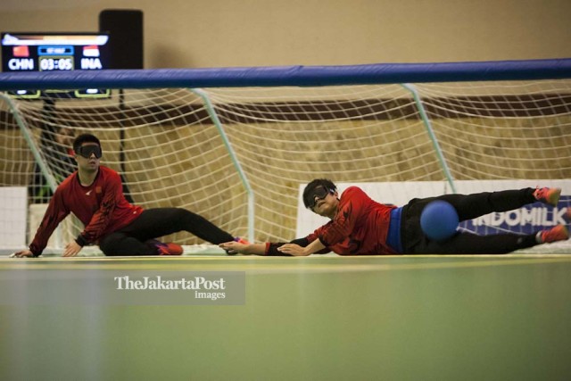 Pemain goalball China, Yang Mingyuan menghalau bola serangan tim goalball Indonesia dalam laga penyisihan goalball putra Asian Para Games 2018 di Balai Kartini, Jakarta, Selasa, 9 Oktober 2018. INAPGOC/Mas Agung Wilis Yudha Baskoro