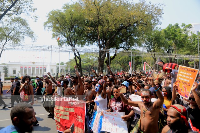 Papuan and activist participate in a Rally in front of the Presidential Palace in Central Jakarta, thursday August 22, 2019. The rally was held to urged the government to solve the racial abuse case to papuan student in Surabaya or let Papua free if the government failed to solve the case. -JP/Seto Wardhana/Adi/19