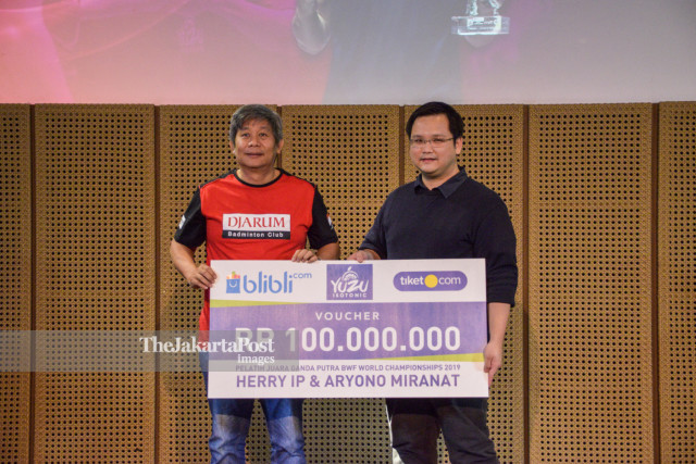 Pelatih ganda putra Indonesia, Herry Iman Pierngadi menerima apresiasi yang diserahkan oleb Head of Marketing YUZU, Ricky Tjitrahardja (kiri) di Galeri Indonesia Kaya, Grand Indonesia, Jakarta Pusat (04/09). Apresiasi tersebut diberikan atas prestasi Ahsan dan Hendra dalam menoreh medali emas pada ajang BWF World Championships 2019.-JP/Anggie Angela/Adi/19