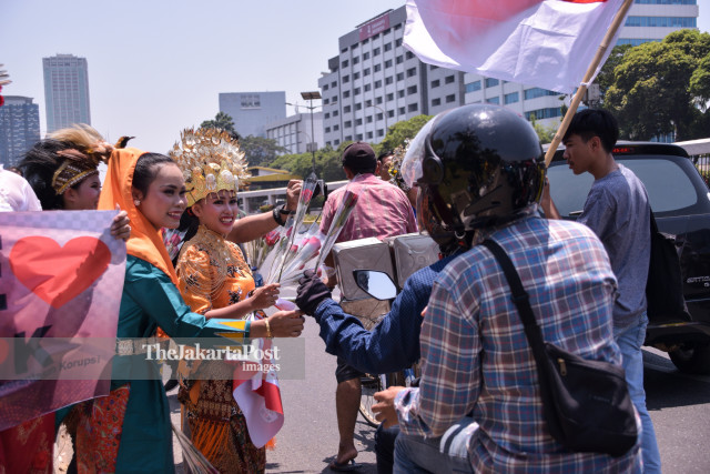 Masyarakat Penegak Demokrasi dan sejumlah mahasiswa melakukan aksi teatrikal membagikan bunga untuk mendukung revisi UU KPK di depan Gedung DPR/MPR RI, Jakarta Pusat (10/09). Para demonstran beranggapan bahwa Revisi UU KPK justru memperkuat kinerja KPK, terutama dengan wacana dibentuknya Dewan Pengawas. - JP/Anggie Angela/Adi/19