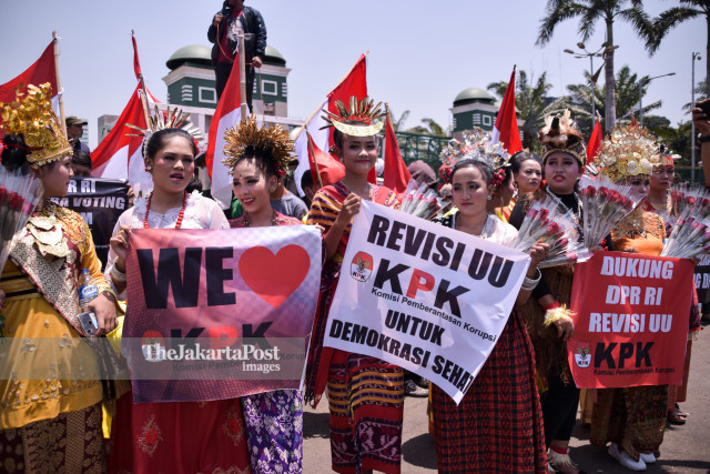 Women wearing traditional attire take part in a demonstration in front of the House of Representatives/People’s Consultative Assembly compound in Senayan, Central Jakarta, on Tuesday, September 10, 2019 to support a revision of the Corruption Eradication Commission (KPK) Law.- JP / Anggie Angela / Adi / 19