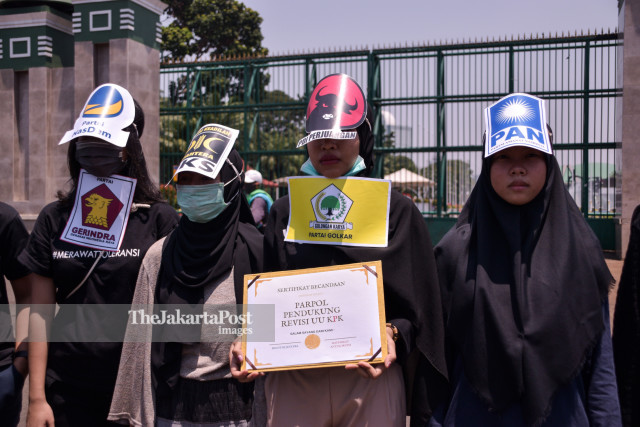 A number of students demonstrated to support the revision of the KPK Law in front of the Republic of Indonesia DPR / MPR Building, Central Jakarta (09/10). The demonstrators assumed that the KPK Law Revision should have been rejected. - JP / Anggie Angela / Adi / 19
