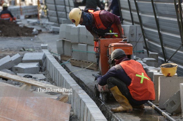 Workers are working on a revitalization of pedesterian projects along the Kramat Raya road, Jakarta, Tuesday, 9/10/2019. The 10 KM project spends a budget of 75 billion. JP / Wendra Ajistyatama / Adi / 19