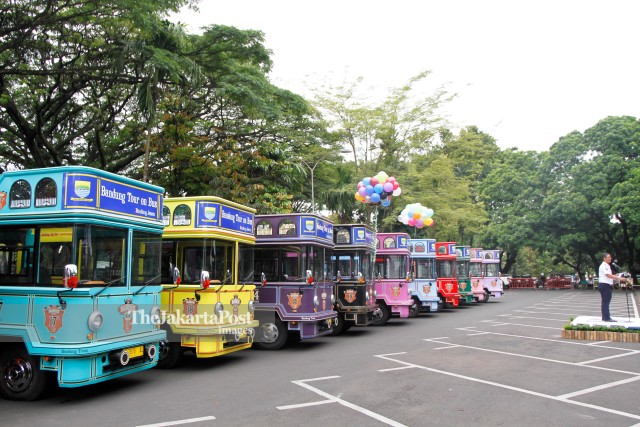 Head of the Bandung City Transportation Agency Didi Irwadi delivered a report on the procurement of 12 Bandung Tour on Bus (Bandros) fleets which cost Rp12.4 billion from the regional budget at the Bandung City Hall Plaza, Friday (1/19). These buses will operate to serve five tourist routes around the city with an estimated cost of IDR 10 thousand-IDR 15 thousand per person for a single trip or IDR 25 thousand-IDR 50 thousand per person for one day trip. - JP / Arya Dipa / Adi / 19