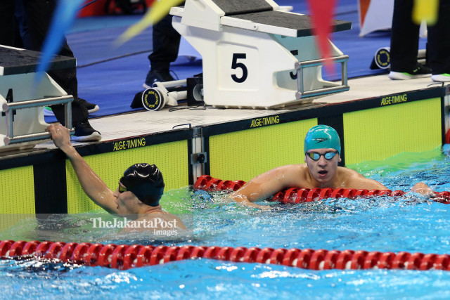 Perenang putra Uzbekistan Dmitriy Horlin (kanan) usai berlaga dalam nomor 200m gaya ganti putra SM13 pada ajang Asian Para Games 2018 di Venue Aquatic GBK,Jakarta, Selasa (9/10). Horlin meraih medali emas sekaligus memecahkan rekor Asia dengan waktu 2 menit 14.20 detik.INAPGOC/TJP Images/Rakhmawaty la'lang/Don/18