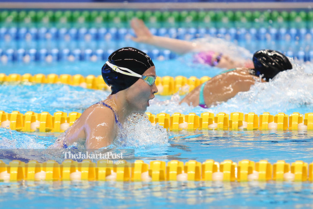 Atlet putri Uzbekistan Amilova Fotimakhon Pecahkan (kiri) Rekor Dunia saat berlaga di nomor gaya ganti perorangan individual putri kelas SM 13 pada ajang Asian Para Games 2018 di Stadion Akuatik, Senayan, Jakarta, Selasa (9/10). INAPGOC/TJP Images/Rakhmawaty la'lang/Don/18