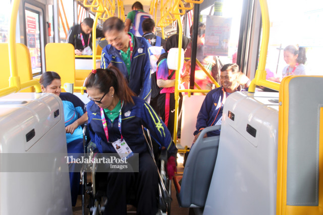 Atlet tenis meja dari beberapa negara peserta Asian Para Games 2018 siap berangkat dari wisma atlet Kemayoran menuju tempat pertandingan di Ecovention Ancol Jakarta, Rabu (10/10/2018). (FOTO/INAPGOC/Dwi Prasetyo)