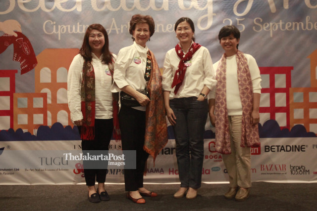 Dovieke Angsana (left), Producer & Artistic Director; Rina Ciputra (second left), President Director of Ciputra Artpreneur; Veronica Tan (second right), Founder of the Waroeng Imaji Foundation; Vanda Parengkuan (right), Writer of Manuscript for Low-Rise Children 2 takes a group photo after holding a press conference at Ciputra Artpreneur, Jakarta, Wednesday, September 25, 2019. - JP / Narabeto Korhama / Adi / 19