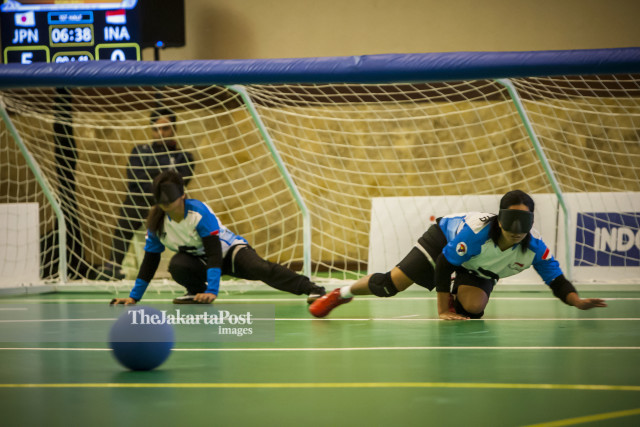 Pemain goalball Indonesia, Ayu Ni Gusti (kanan) dan Sulastri Nita (kiri) menghalau bola serangan tim goalball Jepang dalam laga penyisihan goalball putri Asian Para Games 2018 di Balai Kartini, Jakarta, Rabu, 10 Oktober 2018. INAPGOC/Mas Agung Wilis Yudha Baskoro