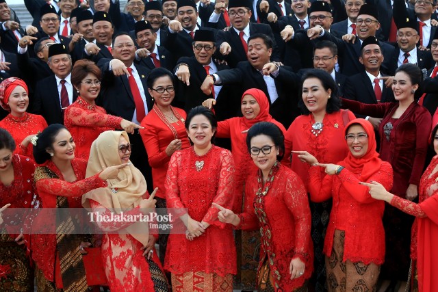Indonesian House of Representatives members from the PDI-Perjuangan faction take pictures while pointing at Puan Maharani at the DPR building, Senayan, Jakarta, Tuesday, October 1, 2019. PDIP who won the most votes in the 2019 election Appoints Puan as Chair of the DPR RI 2019-2024 period. -JP / Seto Wardhana / Adi / 19