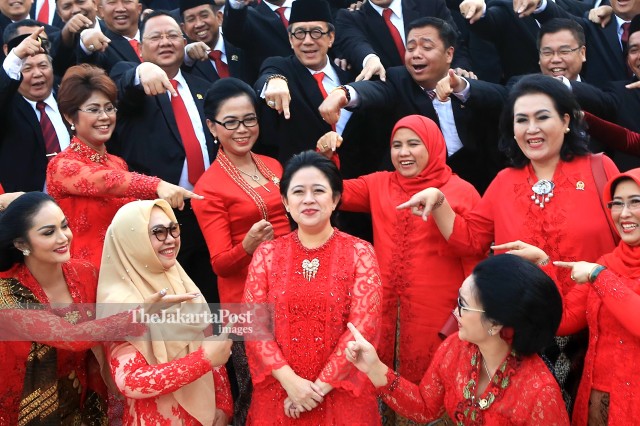 Indonesian House of Representatives members from the PDI-Perjuangan faction take pictures while pointing at Puan Maharani at the DPR building, Senayan, Jakarta, Tuesday, October 1, 2019. PDIP who won the most votes in the 2019 election Appoints Puan as Chair of the DPR RI 2019-2024 period. -JP / Seto Wardhana / Adi / 19