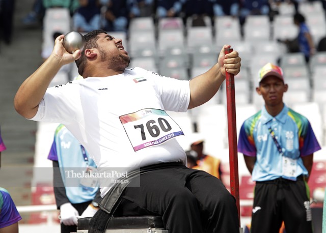 Atlet Uni Emirat Arab Hussain Ali turun pada nomor tolak peluru F34 putra Para Atletik Asian Para Games ke-3 di Stadion Utama Gelora Bung Karno, Jakarta, Rabu (10/10). INAPGOC/ Jessica Margaretha/18