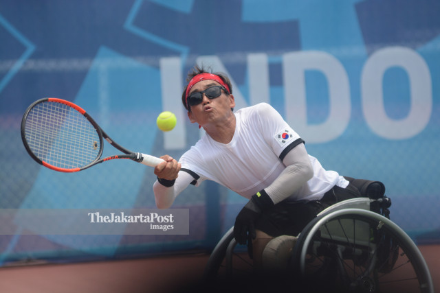 Jakarta, 10 Oktober 2018 KYU SEUNG KIM (KOREA) Babak Semi Final Quad Tunggal Tenis Kursi Roda Asian Para Games 2018 Lapangan Tenis Klub Kelapa Gading Jakarta Rabu (10/10)