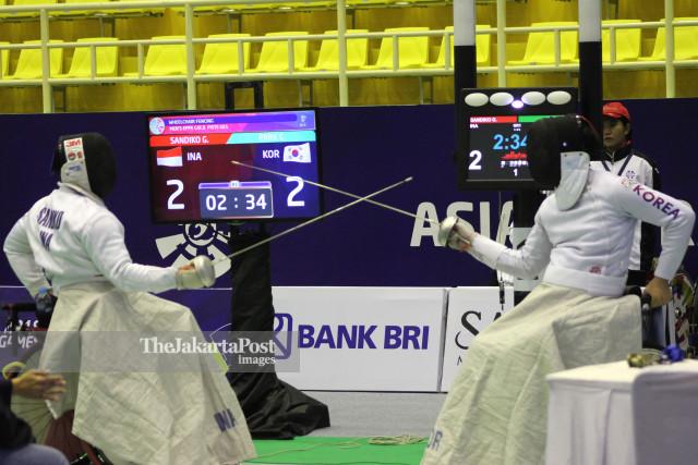 Atlit Anggar Kursi Roda Indonesia Sandiko Gunari Eko Jarot (kiri) berhadapan dengan Atlit Korea Selatan Park Chunhee