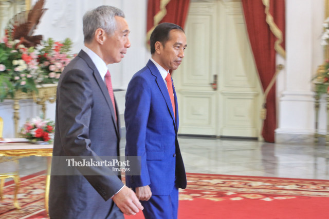 Presiden Joko Widodo menyambut Perdana Menteri Singapura Lee Hsien Loong sebelum Pelantikan Presiden Indonesia di Istana Merdeka, Jakarta, Minggu, 20 Oktober 2019. - JP / Seto Wardhana / Adi / 19