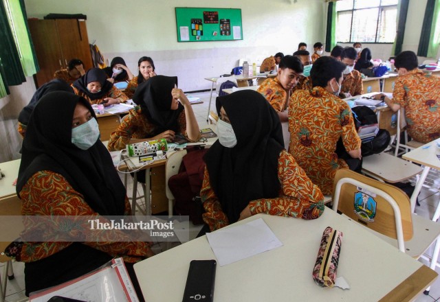 A number of students wore masks as a prevention of Defective disease at SMAN 7 Malang, East Java, Thursday (10/24). After two schools the students and the positive teacher Defteri carrier. There were 212 students and 15 teachers in MIN I in Kota Malanng, and SMA Negeri 7 in Malang, there were 42 students and 20 positive teachers were defters. JP / Aman Rochman / Adi / 19
