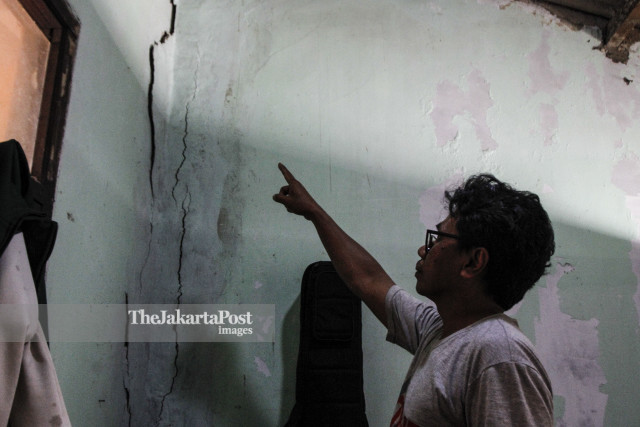 Heru Agam, a resident of RT4 / RW13, Laksana Mekar Village, showed a crack in one of his rooms after the explosion of tunnel construction in the Jakarta-Bandung fast train project in Padalarang District, West Bandung Regency, Thursday (10/24/2019). West Java Governor Ridwan Kamil will summon PT Kereta Api Indonesia China to be in charge of the project as there are problems such as damage to residents' houses and cases of burning Pertamina pipes on the Purwakarta-Bandung-Cileunyi KM 130 toll road when installing piles. - JP / Arya Dipa / Adi / 19