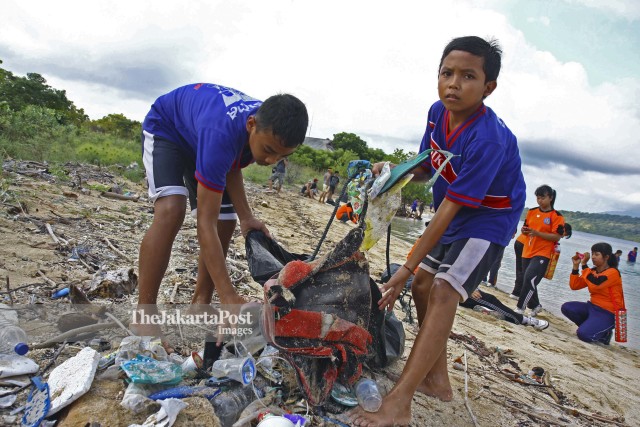 Students picked garbage around the coast of Menjangan Island during a 'beach and underwater clean up' event on Saturday involving 180 students. The small island, famous as a diving and snorkeling spot in Bali, is facing garbage problems. - JP/Stanny Angga /Adi/19